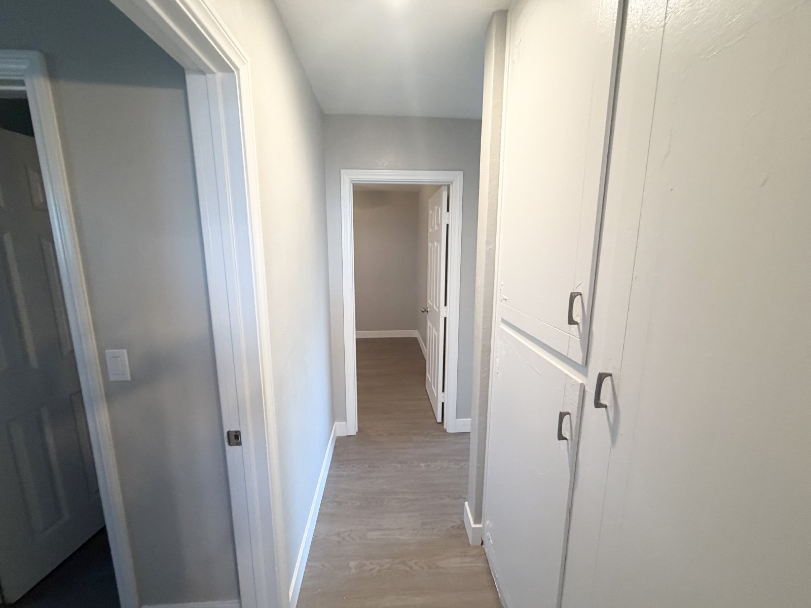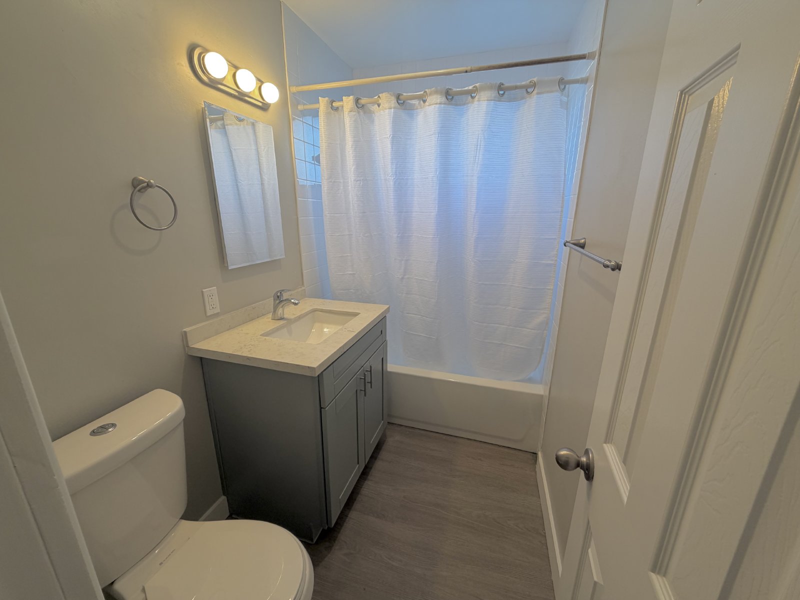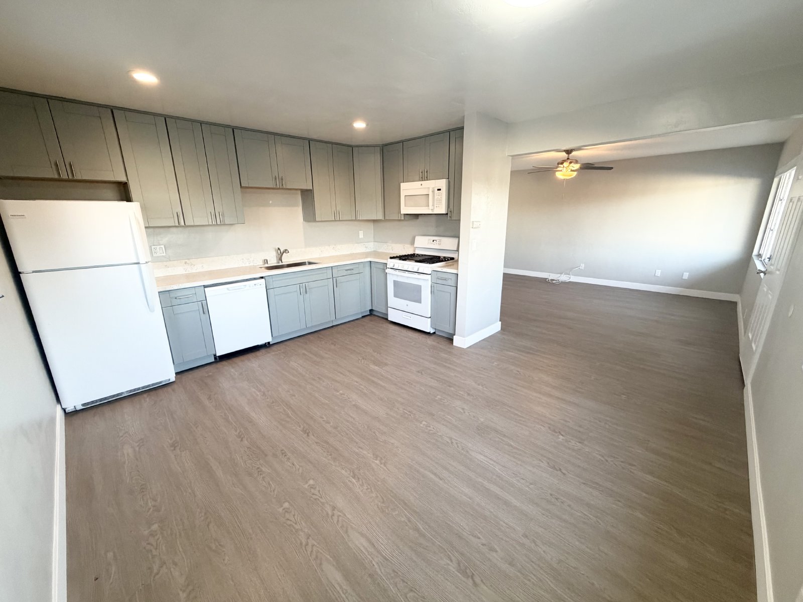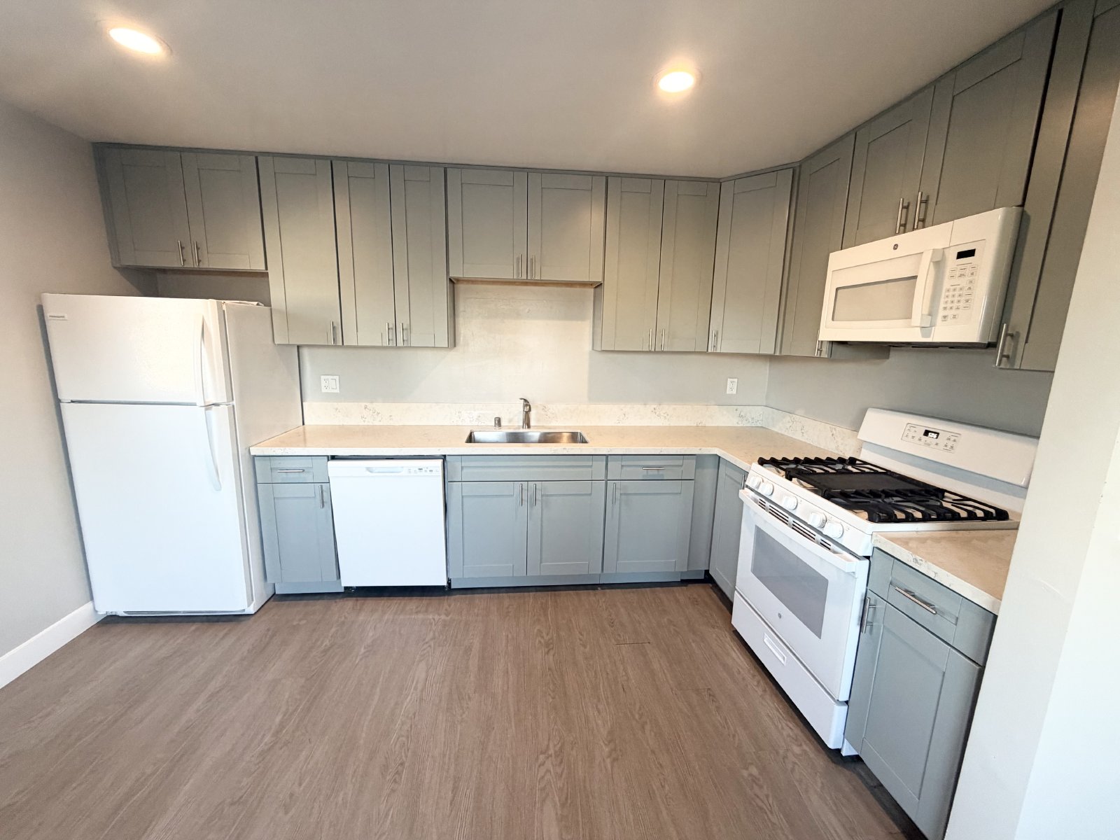 Step inside to a bright and open living space featuring easy-care vinyl flooring throughout and a functional layout ideal for both relaxing and entertaining. The updated kitchen boasts quartz-style countertops, sage-green cabinetry, and a full suite of modern appliances including a gas range, microwave, dishwasher, refrigerator, and oven — everything you need for effortless cooking and dining. Each bedroom is spacious and thoughtfully designed with walk-in closets for ample storage, while additional hall cabinets provide even more organization options. The bathroom features a tub/shower combo with sleek modern fixtures, creating a spa-like touch for your daily routine.